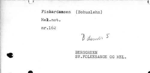 //// Fis&ardansen (Bohuslehn) //// i //// - //// Mei.not. //// nr.162 //// f' //// ! ^ - //// BERGGREEN //// ^ SV.FOLKESANGE OG MEL. ////