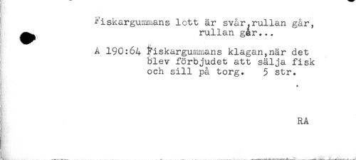 //// Fiskargummans lott är svår,rullan går, //// ^^ rullan går... //// A 190:64 J^iskargurmnans klagan,när det //// I blev förbjudet att sälja fisk //// och sill på torg. 5 str. //// * //// RA ////