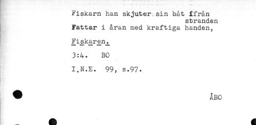 //// Fiskarn han skjuter^ sin båt ifrån //// stranden //// Fattar i åran med kraftiga handen. //// [. - . ... //// Fiskar-en^ //// t //// 3:4. BO //// I.N.E. 99, s.97. //// ti ////