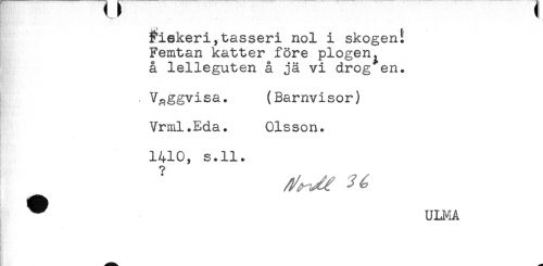 //// ^iekeri,tasseri nol i skogent //// Femtan katter före plogen^ //// å lelleguten å jä vi drog en. //// Vaggvisa. (Barnvisor) //// Vrml.Eda. Olsson. //// 1410, s.ll. //// ^ ULMA ////