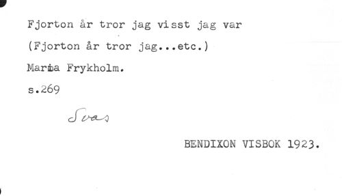 //// Fjorton år tror jag visst jag var //// (Fjorton år tror jag...etc.) //// Marsaa Frykholm. //// s.269 //// c //// /BENDIXON VISBOK 1923. ////