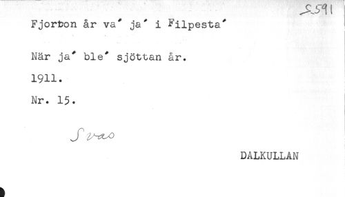 //// - ^^ //// Fjorton år va^ ja^ i Fiipesta" //// När ja^ ble" sjöttan år. //// 1911. //// Nr. 15. //// DALKULLAN ////