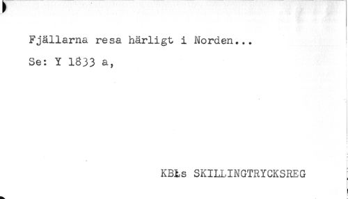 //// Fjällarna resa härligt i Norden... //// Se: Y 1833 a, //// - - L //// i //// { //// t //// r //// f //// i //// KBLs SKILLINGTRYCKSREG //// ! //// <* ////