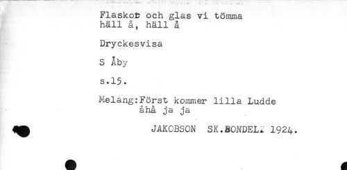 //// Fiaskot och glas vi tömma //// häll å, häll å //// Dryckesvisa //// S Åby //// s.15. //// Melang:Först kommer lilla Ludde //// åhå ja ja //// JAKOBSON SK.BONDELZ 1924. ////