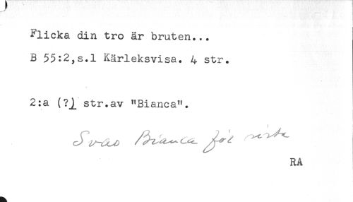 //// Flicka din tro är bruten... //// B 55:2,s.l Kärleksvisa. 4 str. //// 2:a (?J[ str.av "Bianca". //// RA ////