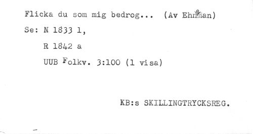 //// Flicka du som mig bedrog... (Av EhiÉian) //// Se: N 1333 1, //// R 1842 a //// UUB *'olkv. 3:100 (1 visa) //// KB:s SKILLINGTRYCKSREG. ////