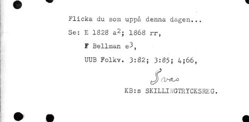 //// Flicka du som uppå denna dagen... //// Se: E 1328 a^; Ig68 rr, //// F Bellman e3, //// * //// UUB Folkv. 3:32; 3:35; 4;66, //// KB:s SKILLINGTRYCKSRE.G. ////