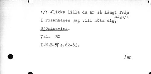 //// :/: Flicka lilla du är så långt från //// mig:/: //// I rosenhagen jag vill möta dig, //// Sjömansvisa. //// 7:4. BO //// I.N.E.9? s.62-63. ////