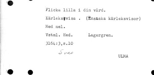 //// ' ... //// Flicka lilla i din vård. //// Kärleksgvisa . (Éns&aka kärleksvisor) //// Med mel. //// Vstml. Hed. Lagergren. //// 3164:3,s.10 //// ULMA ////