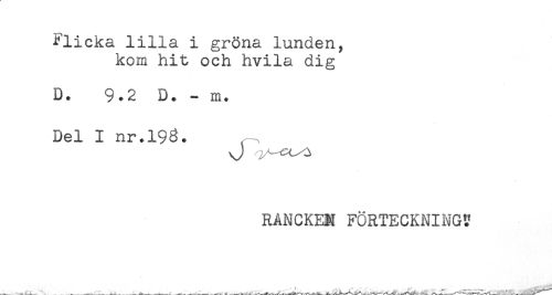 //// Flicka lilla i gröna lunden, //// kom hit och hvila dig //// D. 9.2 D. - m. //// Del I nr.19^. //// RANCKEN FÖRTECKNING? ////