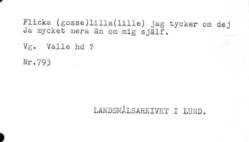 //// Flicka (gosse)lilla(lille) jag tycker om dej //// Ja mycket mera än om mig själf. //// Vg. Valle hd ? //// Nr.793 //// LANDSMÅLSARKIVET I LUND. ////