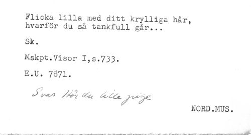 //// Flicka lilla med ditt krylliga hår, //// hvarför du så tankfull går..* //// Sk. //// Mskpt.Visor I,s.733. //// E.U. 7871. //// NORD.MUS. ////