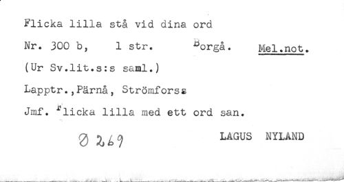 //// t //// Flicka lilla stå vid dina ord //// Nr. 300 b, 1 str. ^orgå. Mel.not. //// (Ur Sv.lit.s:s saml.) //// Lapptr.,Pärnå, Strömfors & //// Jmf. °^licka lilla med ett ord san. //// 0 LAGUS NYLAND ////