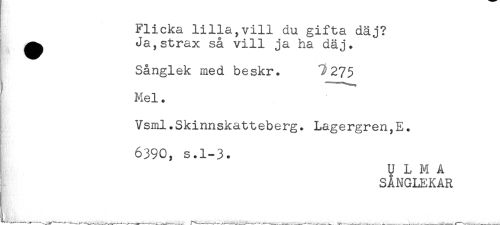//// Flicka lilla,vill du gifta däj? //// ^ Ja,strax så vill ja ha däj. //// Sånglek med be skr. *?275 //// ^ Mel. //// Vsml.Skinnskatteberg. Lagergren,E. //// 6390, s.1-3. //// ! U L M A //// SÅNGLEKAR ////