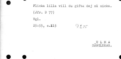 //// Flicka lilla vill du gifta dej så nicka. //// (Jfr. D 77) //// Vgl. //// 25:55, s.kl5 9^/J" //// U L M A //// SÅNGLEKAR. //// * ////