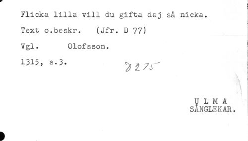 //// Flicka lilla vill du gifta dej så nicka. //// Text o.beskr. (Jfr. D 77) //// Vgl. Olofsson. //// 1315, s.3. //// * //// U L M A //// SÅNGLEKAR. ////