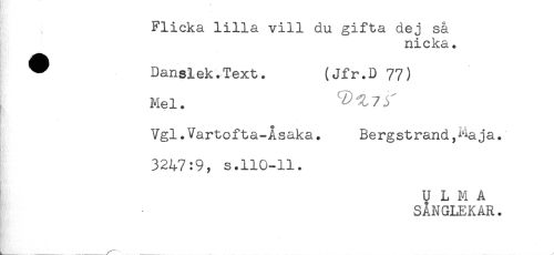 //// Flicka lilla vill du gifta dej så //// nicka. //// ^ Danslek.Text. (Jfr.D 77) //// Mel. ^t/ ' //// Vgl.Vartofta-Åsaka. Bergstrandja. //// 3247:9, s.110-11. //// U L M A //// SÅNGLEKAR. //// i' //// L-... .....___ ////