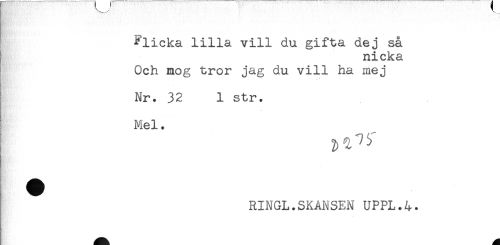 //// ^licka lilla vill du gifta dej så //// nicka //// ! Och mog tror jag du vill ha mej //// Nr. 32 1 str. //// Mel. //// a //// ^ RINGL.SKANSEN UPPL.4. ////