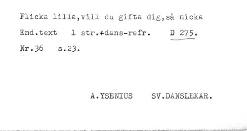 //// Flicka lilla,vill du gifta dig,så nicka //// End.text 1 str.+dans-refr. D 275. //// Nr.36 s.23. //// A.YSENIUS SV.DANSLEKAR. ////