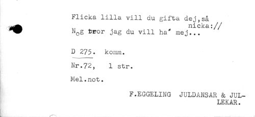 //// Flicka lilla vill du gifta dej,så //// N^g ^or jag du vill ha/ mej... //// D 275. kc-mm. //// Nr.72, 1 str. //// Mel.not. //// F.EGGELING JULDANSAR & JUL- //// LEKAR . //// L . ... ////