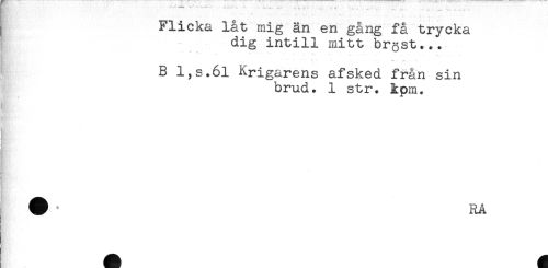 //// Flicka låt mig än en gång få trycka //// dig intill mitt brgst... //// * * - * *-.. //// B l,s.6l Krigarens afsked från sin //// brud. 1 str. kpm. ////