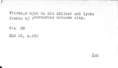 //// Flicka,o njut du din sällhet och lycka //// frukta ej stommmas hotande slag. //// 6:4 NB //// SLS 22, s.532 //// i //// ! //// ÅBO ////