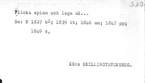 //// flicka spinn och laga så... //// Se: E 1827 b2; 1^39 tt; 1846 mm; 1847 pp; //// 1849 z, //// ! //// t //// * //// KB:s SKILLINGTRYCKSREG. //// . ////