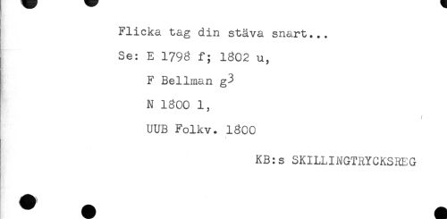//// Flicka tag din stäva snart... //// B' //// Se: E 1798 f; 1802 u, //// F Bellman g3 //// N 1800 1, //// f //// UUB Folkv. 18CC //// KB:s SKILLINGTRYCKSREG ////