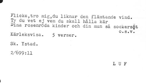 //// Flicka,tro mig,du liknar den flämtande vind. //// Ty du vet ej vem du skall hålla kär //// Dina rosenröda kinder och din mun så sockerset //// v-- -i i - ^ o.s.v. //// Karleksvisa. $ verser. //// Sk. Ystad. //// 2/699:11 //// L U F ////