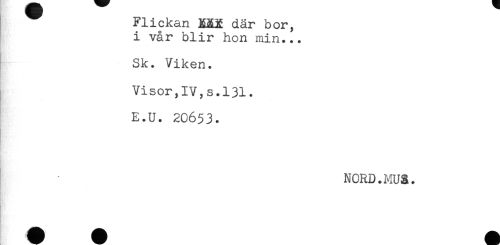//// Flickan KKX där bor, //// i vår blir hon min... //// Sk. Viken. //// Visor,IV,s.131. //// E.U. 20653. //// NORD.MUS. ////