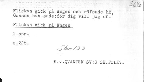 //// -- ' * A M + ... + ... ".___.. ... . ' //// Flickan gick på ängen och räfsade hö, //// Gossen han sade:för dig vill jag dö. //// Flickan gick på ängen //// 1 str. //// s.226. //// E.v.QVANTEN SV:S SK.FOLKV. ////