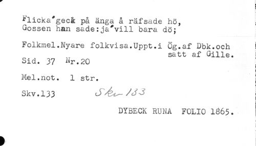 //// *'licka*gec& på änga å räfsade hö, //// Gossen han sade:ja*vill bara dö; //// Folkmel.Nyare folkvisa.Uppt.i Ög.af Dbk.och ! //// satt af Gille. //// Sid. 37 Nr.20 //// i //// < //// ! //// Mel.not. 1 str. j //// Skv.133 J^ét- //// DYBECK RUNA FOLIO 1Ö65. //// t //// i //// t ////