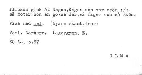 //// Flickan gick åt ängen,ängen den var grön :/: //// så möter hon en gosse där,så fager och så skön. //// Visa med mel. (Nyare skämtvisor) //// Vsml. Norberg. Lagergren, E. //// 80 44, s.87 //// U L M A ////