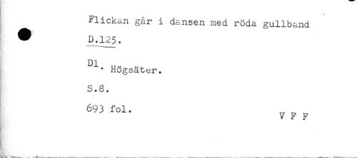 //// Flickan går i dansen med röda gullband //// D.125. //// Högsäter. //// S.g. //// 693 fol. //// V F F //// . //// ^f* ----- ^ . - -^ .--. . - . . .. - .. - ---- . .. -.. . -. A--W---- - - _ -T--... -.. / --- ////