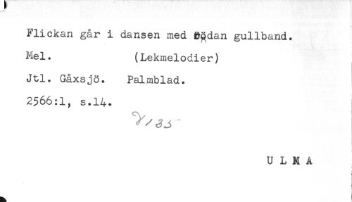 //// - //// Flickan går i dansen med B^dan gullband. //// Mel. (Lekmelodier) //// Jtl. Gåxsjö. Palmblad. //// 2566:1, s.14. //// i ////