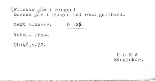 //// (Flickan gar i ringen) //// Gossen går i ringen med röda gullband* //// text m.heskr. D 12$ //// Vstml. Irsta //// 90:46,s.72. //// U L M Å //// Sånglekar. ////