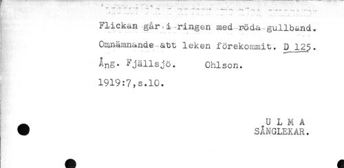 //// T- "" ' - - "" ' * -- - .... .. _ ....... .. . , //// ' - ..... .. . //// Flickan går-i-ringen med rödagullband. //// Omnämnande att leken förekommit. O 125. //// Ang- Fjällsjö. Ohlson. //// 1919:7,s.l0. ////