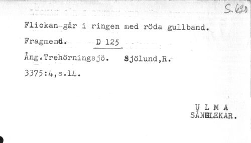 //// -.....- - - - - - - - - .....* ..... . - //// * ' //// Flickan går i ringen med röda gullband. //// ... . I //// Fragment. D 125 //// Ang.Trehörningsjö. Sjölund,R. //// 3375:4,s.14. //// t ' ////