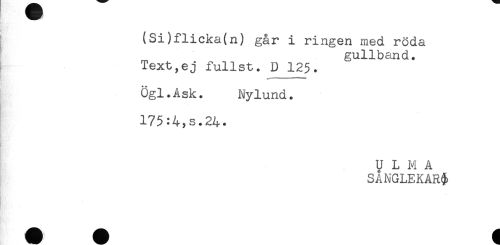 //// kL,'.. //// (Si)flicka(n) går i ringen med röda //// gullband. //// Text,ej fullst. D 125. //// Ögl.Ask. Nylund. //// 175:4,s.24. //// U L M A //// SÅNGLEKAR^ //// !. , * ' ////