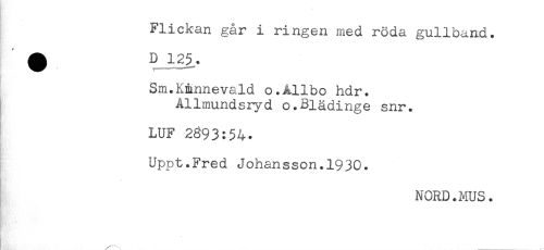 //// Flickan går i ringen med röda gullband. //// Sm.K&nnevald o.Allbo hdr. //// Allmundsryd o.Blädinge snr. //// LUF 2893:54. //// Uppt.Fred Johansson.1930. //// NORD.MUS. //// S t ' * ////