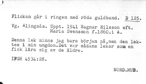 //// Flickan går i ringen med röda guldband. D 125. //// Vg. Alingsås. Uppt. 1941 Ragnar Nilsson eft. //// Maria Svensson f.l360.i A. //// Denna lek minns jag bara början på,men den lek- //// tes i mm ungdom. Det var sådana lekar som en //// fick lära sig av de äldre. //// IFGH 4534:23. ////
