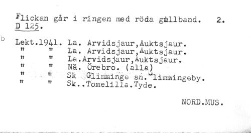 //// blickan går i ringen med röda gmllband. 2. //// D 125. //// jr*^ //// ^ Lekt.1941. La. Arvidsjaur,Auktsjaur. //// " " La. Arvidsjaur,Auktsjaur. //// " " La.Arvidsjaur,Auktsjaur. //// " " Nä. Örebro, (alla) //// " " Sk Glimminge sn.^lMmingeby. //// " " Sk..Tomelilla.Tyde. //// NCRD.MUS. ////