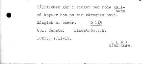 //// (A)flickan går i ringen med röda gnll- //// bann //// ^ så knyter hon om sin kärestas hand. //// Sånglek m. beskr. D 1^5 //// Upl. Tensta. Lindström,J.W. //// 1S225, s.11-12. //// U L M A //// SÅNGLEKAR. ////