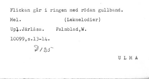 //// Flickan går i ringen med rödan gullband. //// Mel. (Lekmelodier) //// Up^.Järlå sa. Palmblad,W. //// 10099,s.13-14. //// U L M A ////