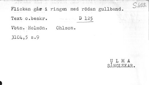 //// Flickan gar i ringen med rödan gullband. " //// Text o.beskr. D 12$ //// Vbtn.-Holmön. Ohlson. //// <- * i, //// 3104,5 s.9 ////