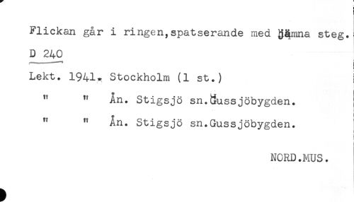 //// F //// Flickan går i ringen,spatserande med R^mna steg. //// D 240 //// Lekt. 1941- Stockholm (1 st.) //// " " Ån. Stigsjö sn.gussjöbygden. //// " " Ån. Stigsjö sn.Gussjöbygden. //// i ////