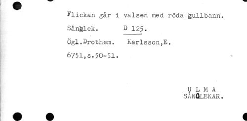 //// r //// Flickan går i valsen med röda gullbann. //// b < //// Sånglek. D 12$. //// * //// Ögl.Drothem. Karls son,E. //// 6751,s.50-51. ////