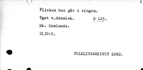 //// Flickan hon går i ringen. //// Tgxt t.danslek. D 125. //// Sk. Onslunda. //// 2130:5. //// FOLKLIVSARKIVET LUND. ////