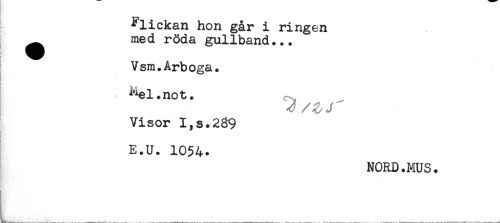 //// Flickan hon går i ringen //// med röda gullband... //// I Vsm.Arboga. //// ^el.not. c-^ //// ^ /. J " //// Visor I,s.289 //// E.U. 1054* //// NORD.MUS. //// . _ , __ ////