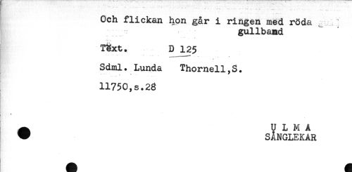 //// Och flickan hon går i ringen med röda g //// gullbamd //// T^xt. D 125 //// Sdml. Lunda Thornell.S. //// "' ....... ^ ' - * //// 11750,s.28 //// t //// < ////